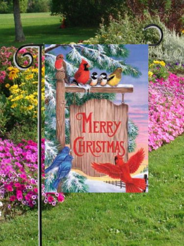 CHRISTMAS SIGN POST Birds heat sublimated (printed) garden flag. Finely detailed artwork from top artists printed on durable, weather-resistant fabric. Design can be seen clearly from either side (reverse image on backside). Premium flag measures 12 inches x 18 inches made of polyester with a 1 inch pole sleeve for hanging. Flag fits on a standard garden flag pole. Flag is washable and can be ironed.