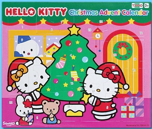 The Iconic collectable Hello Kitty Advent Calendar.Open a window everyday for 24 days to reveal two Hello Kitty figures,two santa hats for Hello Kitty figures,plus accessories,presents,christmas cake and more.After 24 days are up and all the windows open use the box to complete the Hello Kitty xmas room.Complete with furniture to make the complete room.Sanrio Licensed.Designed by Toho of Japan.For ages 3 years and up.